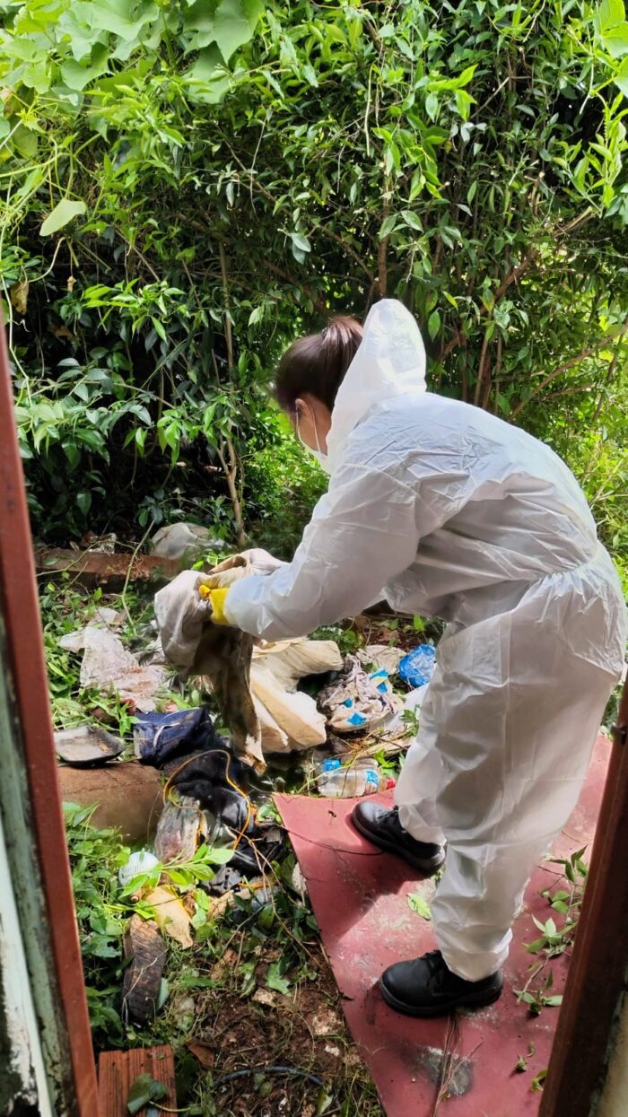 Agentes de endemia retiram lixo acumulado em residência devido à condição insalubre e risco à saúde pública