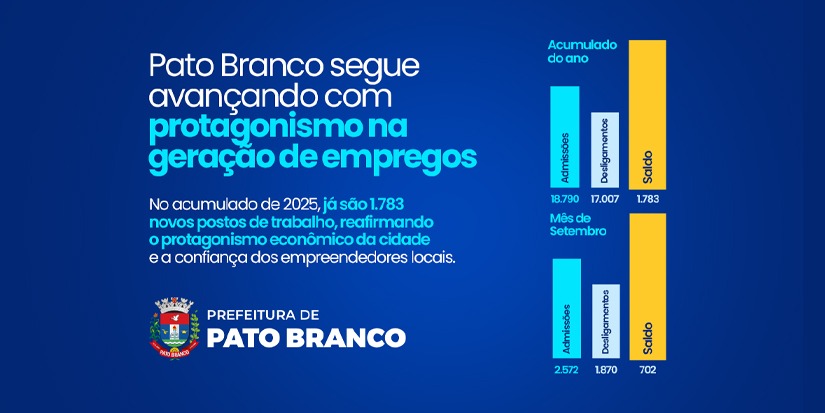 Os dados confirmam o cenário positivo para Pato Branco, que segue ampliando sua participação no desenvolvimento econômico regional, impulsionado pela abertura contínua de novas oportunidades no mercado de trabalho.