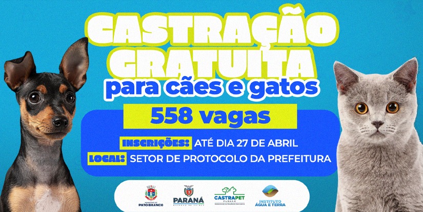 O programa vai disponibilizar 558 vagas para castração gratuita de cães e gatos. As inscrições devem ser feitas no setor de Protocolo da Prefeitura de Pato Branco, situado na rua Caramuru, nº 271, no centro.