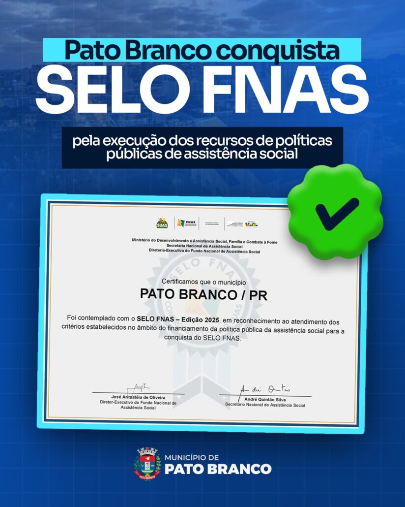 Pato Branco recebeu mais um reconhecimento pelo trabalho junto à comunidade. Conquistou o SELO FNAS – Edição 2025 pela execução dos recursos de políticas públicas de assistência social. O selo representa o compromisso da gestão com a aplicação dos recursos do Fundo Nacional de Assistência Social (FNAS).
