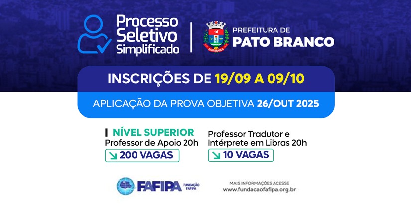 O candidato deverá observar, rigorosamente, as formas de divulgação estabelecidas no Edital e demais publicações nos endereços eletrônicos: www.fundacaofafipa.org.br e www.patobranco.pr.gov.br. A prova objetiva será aplicada no dia 26 de outubro de 2025.