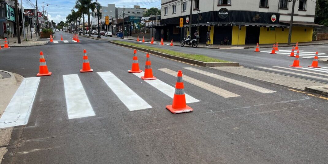 Nesta quarta-feira (12), a Prefeitura de Pato Branco, por meio da Secretaria Municipal de Engenharia e Obras, realizou a instalação de uma faixa elevada na Avenida Tupi, no trecho entre as ruas Manoel Ribas e Nereu Ramos. A medida visa substituir as lombadas eletrônicas, desativadas devido à não renovação do contrato com a empresa responsável, e proporcionar mais segurança aos pedestres, especialmente na área de bares, onde o fluxo de pessoas é intenso.