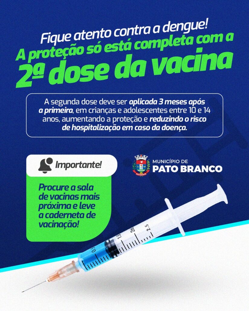 A Secretaria Municipal de Saúde de Pato Branco reforça à população a importância de completar o esquema vacinal contra a dengue com a aplicação da segunda dose da vacina. A imunização completa é fundamental para garantir proteção eficaz e duradoura contra a doença.